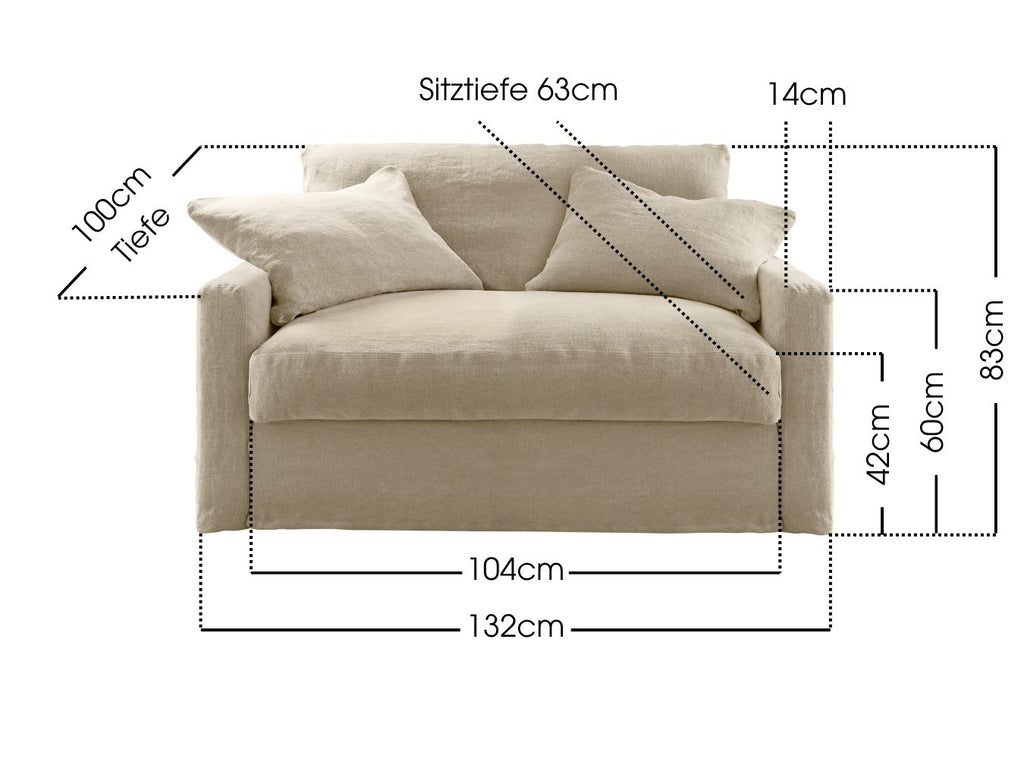 | Alle Überzüge und Hussen können für die Reinigung abgenommen werden. Zur Reinigung der Hussen empfehlen wir, aufgrund der Größe, eine proffessionelle Reinigung in Anspruch zu nehmen, damit die Form gewährleistet bleibt. Das Sofa wird individuell für dich hergestellt, daher können alle Bezüge auch einzeln ausgetauscht werden. mehr über die Plege von Leinen erfahren |