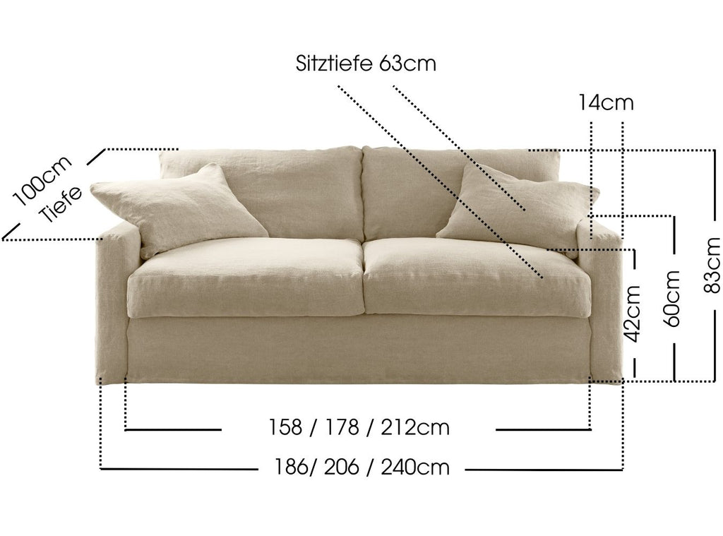 | Sofa Bezug: Alle Bezüge sind abnhembar. In die Kissenbezüge sind Reißverschlüsse eingenäht. Die Hussen sind mit Klettverbindungen befestigt. Alle Nähte sind als Doppelnaht ausgeführt. Hergestellt aus 100% französischem Leinen, ÖKOTex zertifiziert, Gewebe: 390g/m3, Abriebbeständig: 25000 Martindale