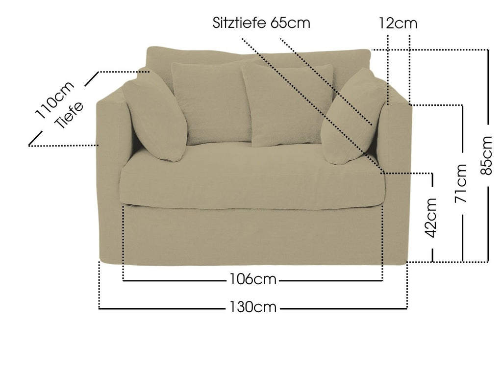 | Alle Überzüge und Hussen können für die Reinigung abgenommen werden. Zur Reinigung der Hussen empfehlen wir, aufgrund der Größe, eine proffessionelle Reinigung in Anspruch zu nehmen, damit die Form gewährleistet bleibt. Das Sofa wird individuell für dich hergestellt, daher können alle Bezüge auch einzeln ausgetauscht werden. mehr über die Plege von Leinen erfahren |