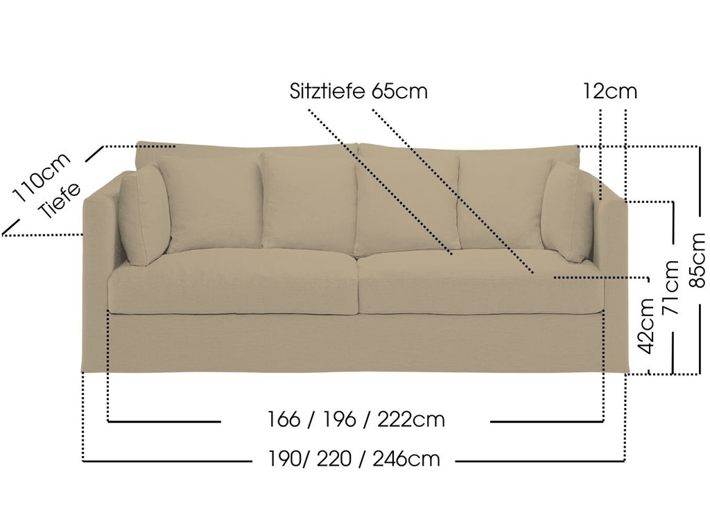 | Sofa Bezug: Alle Bezüge sind abnhembar. In die Kissenbezüge sind Reißverschlüsse eingenäht. Die Hussen sind mit Klettverbindungen befestigt. Alle Nähte sind als Doppelnaht ausgeführt. Hergestellt aus 100% französischem Leinen, ÖKOTex zertifiziert, Gewebe: 390g/m2, Abriebbeständig: 25000 Martindale