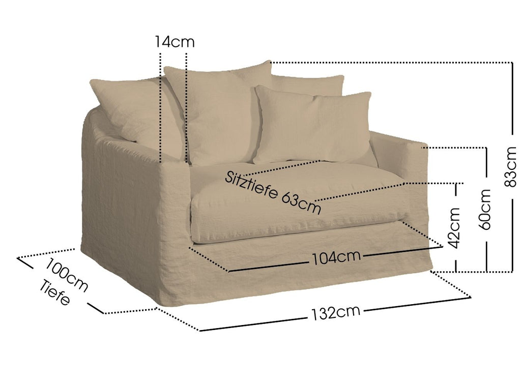 | Alle Überzüge und Hussen können für die Reinigung abgenommen werden. Zur Reinigung der Hussen empfehlen wir, aufgrund der Größe, eine proffessionelle Reinigung in Anspruch zu nehmen, damit die Form gewährleistet bleibt. Das Sofa wird individuell für dich hergestellt, daher können alle Bezüge auch einzeln ausgetauscht werden. mehr über die Plege von Leinen erfahren |